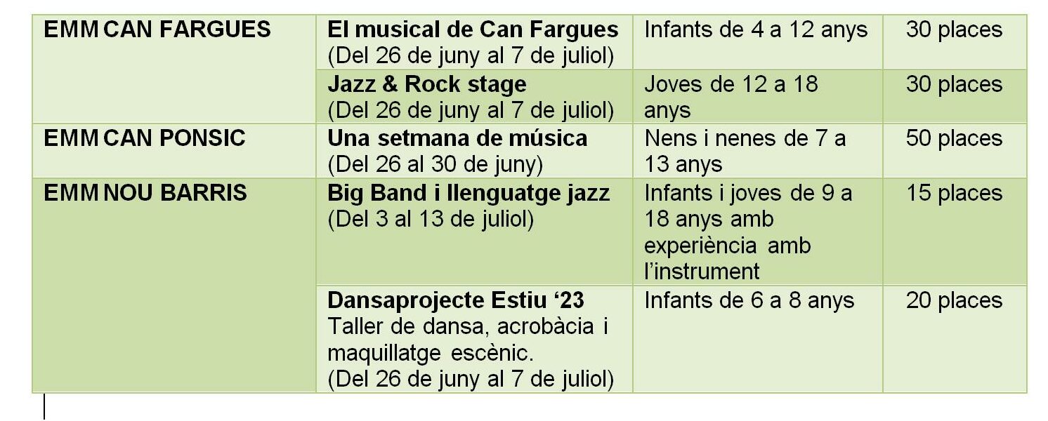 Les escoles de música municipals també tenen obertes, a través de les respectives pàgines web, les preinscripcions a les activitats que desenvoluparan durant la campanya de vacances d’estiu 2023. Ofereixen un total de 145 places en tres de les escoles i per desenvolupar activitats diverses: