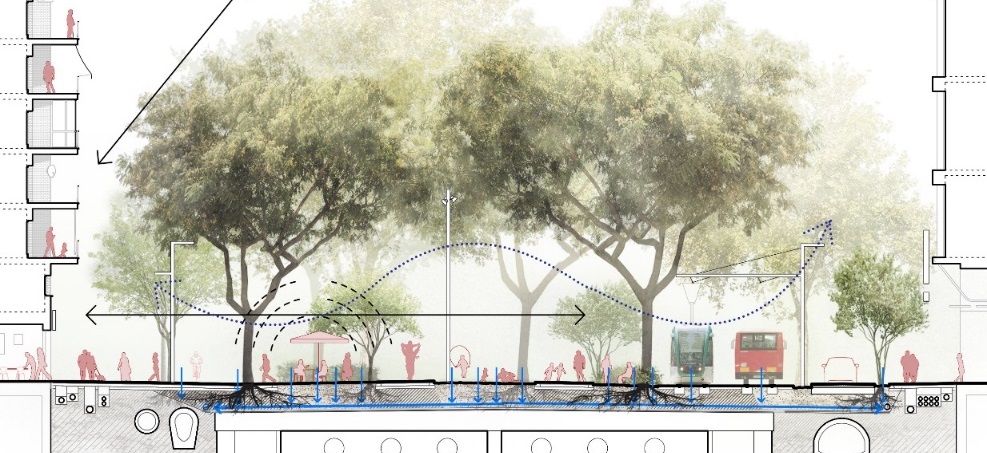Aquest àmbit, d’uns 50 metres d’amplada, es convertirà en un espai on el verd serà el protagonista. Amb la plantació d’uns 450 arbres s’aconseguirà una gran arbrada amb zones d’ombra i arbustos que afavoriran la diversitat biològica i ajudaran a delimitar les zones de joc i d’estada. A la banda on hi ha els edificis d’habitatges hi haurà una vorera de 5,25 metres d’amplada que s’ampliarà fins a 7,35 quan no hi ha cordó de serves, un carril en plataforma única que integrarà el pas de bicicletes, el trànsit local i els vehicles de serveis. A l’altra banda, la del centre comercial, hi haurà una vorera de 4 metres, un carril d’ús local i bicicletes i un espai per al tramvia desdoblat i busos en doble sentit. Per tant, es prioritzarà la mobilitat sostenible, els recorreguts a peu i els usos ciutadans, a diferència de la configuració anterior a la posada en marxa dels túnels, quan hi havia vuit carrils per a vehicles.