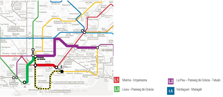 - Metro L1 (Glòries, Marina, Clot), Metro L2 (Clot- La Pau), Metro L4 (La Pau, Besòs, El Maresme, Selva de Mar)