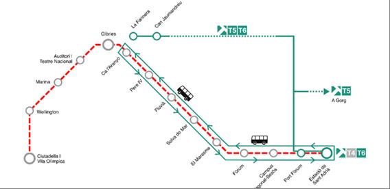 - Llançadora de bus entre Glòries i l’Estació de Sant Adrià, 9 parades (Ca l’Aranyò, Pere IV, Fluvià, Selva de Mar, El Maresme, Fòrum, Campus Diagonal-Besòs, Port Fòrum, Estació de Sant Adrià) amb el mateix horari de funcionament que el servei de TRAM.