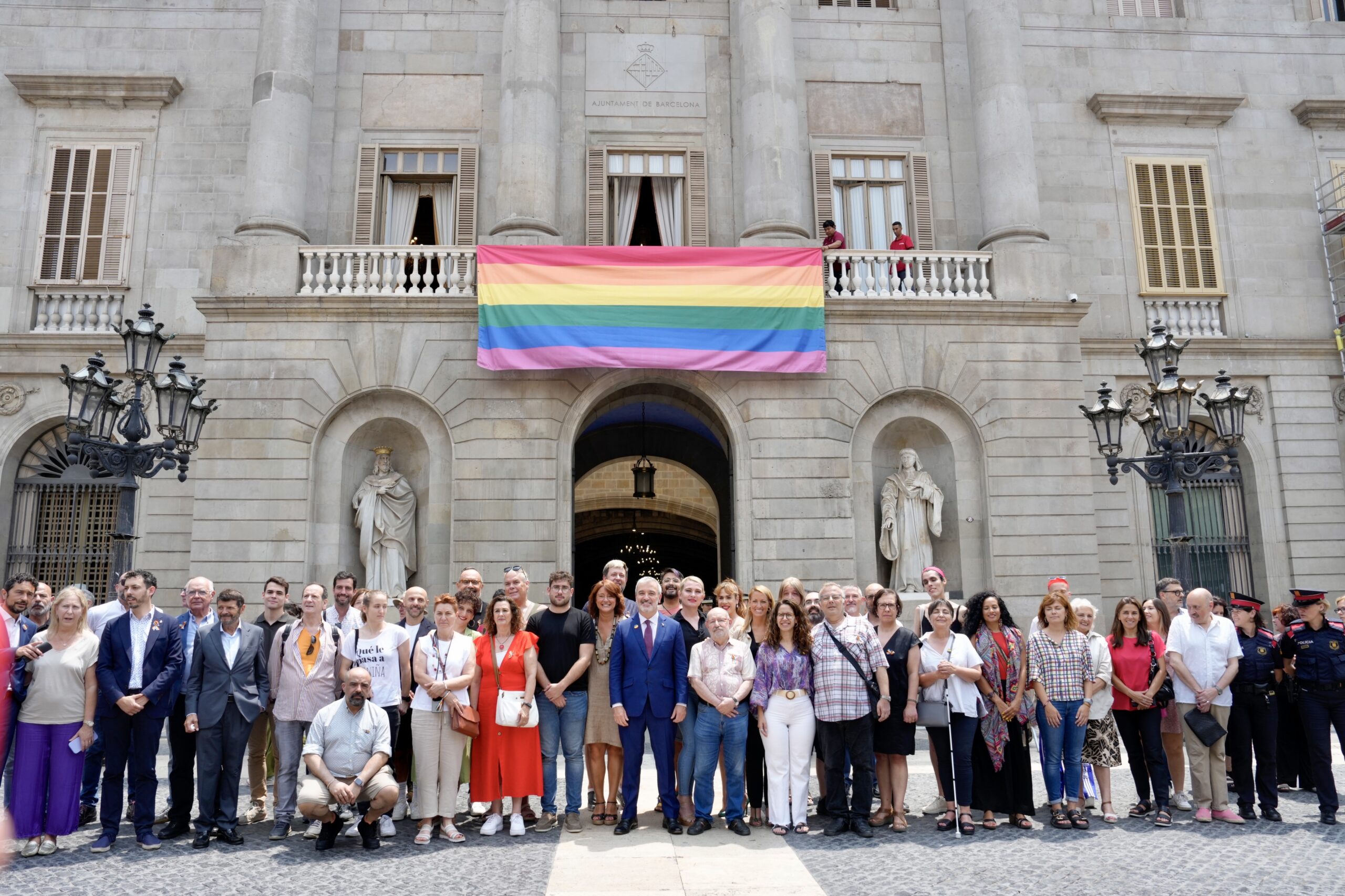 - Aquest migdia, l’alcalde de Barcelona, Jaume Collboni, ha presidit la recepció d’entitats i la penjada del penó amb l’Arc de Sant Martí al balcó de l’Ajuntament amb motiu del Dia Internacional de l’Orgull LGTBI.