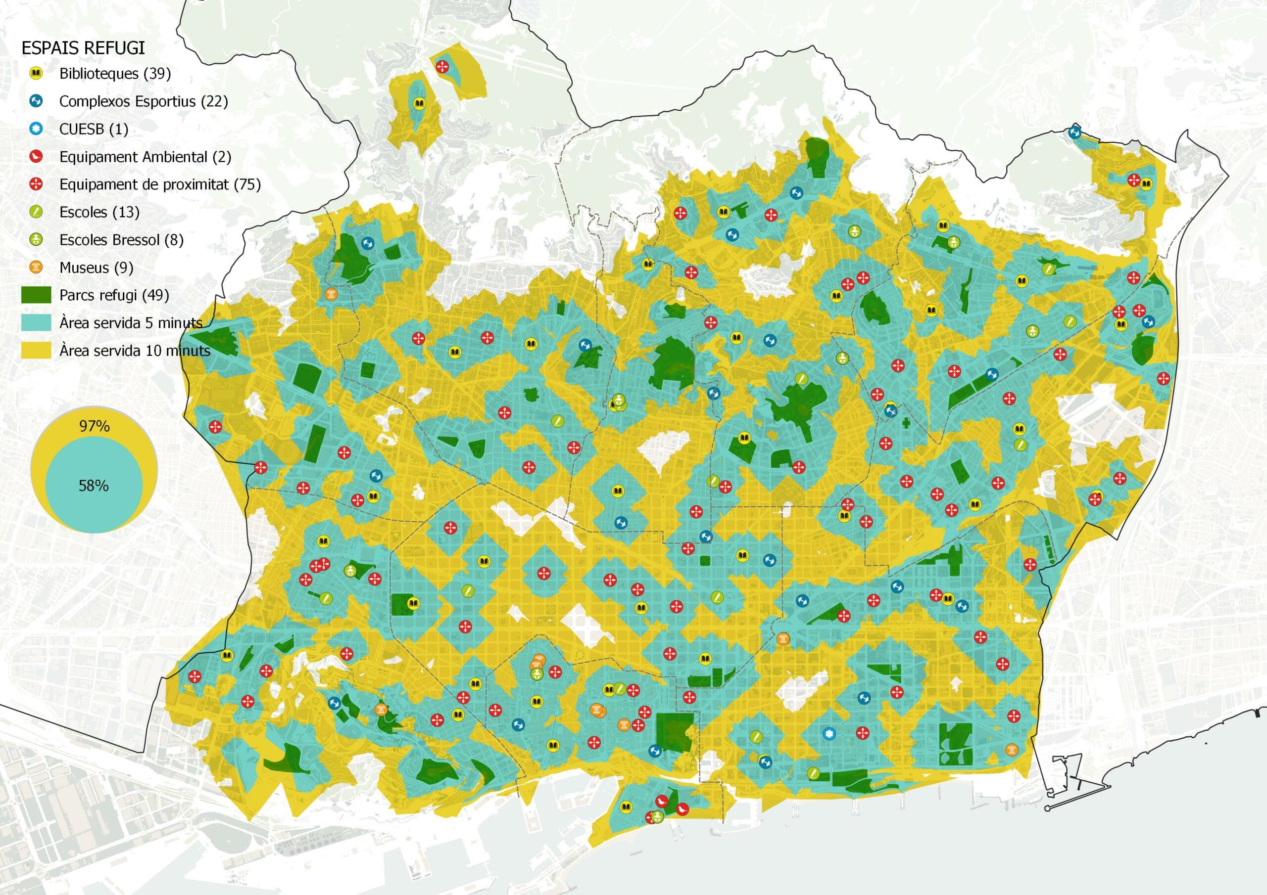 Actualment el 58% de la població té un refugi climàtic a 5 minuts a peu des de casa seva i el 97% de la ciutadania en té un a un màxim de 10 minuts en dia feiner.