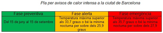 Així doncs, tot i que el Pla per avisos de calor intensa es troba actiu en la seva fase preventiva des del passat 15 de juny i ho estarà fins al proper 15 de setembre, a la ciutat de Barcelona es contempla una fase d’alerta per calor intensa en cas que la temperatura diürna màxima superi els 33,7 graus centígrads o bé quan la temperatura mínima nocturna sigui superior als 25,9 graus. A més a més, si la temperatura màxima supera els 35,7 graus o bé la mínima s’enfila per sobre dels 27,9 graus s’activarà la tercera i última fase d’emergència per calor molt intensa.