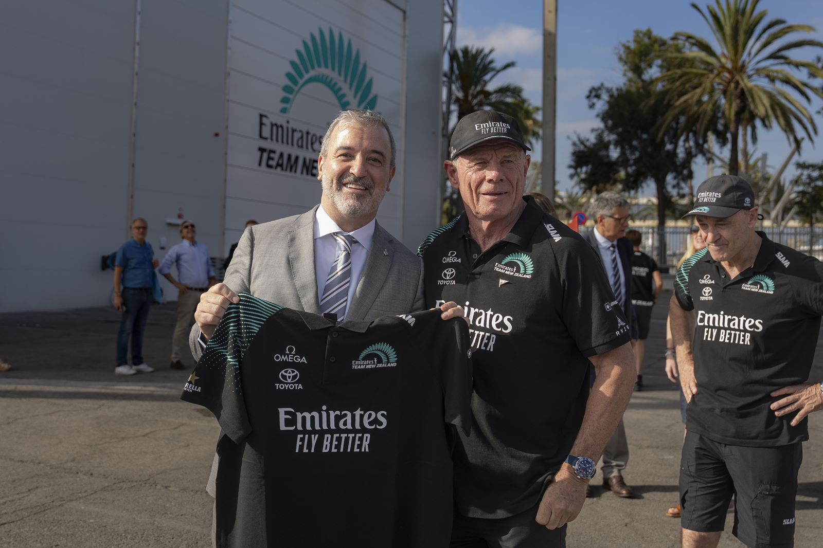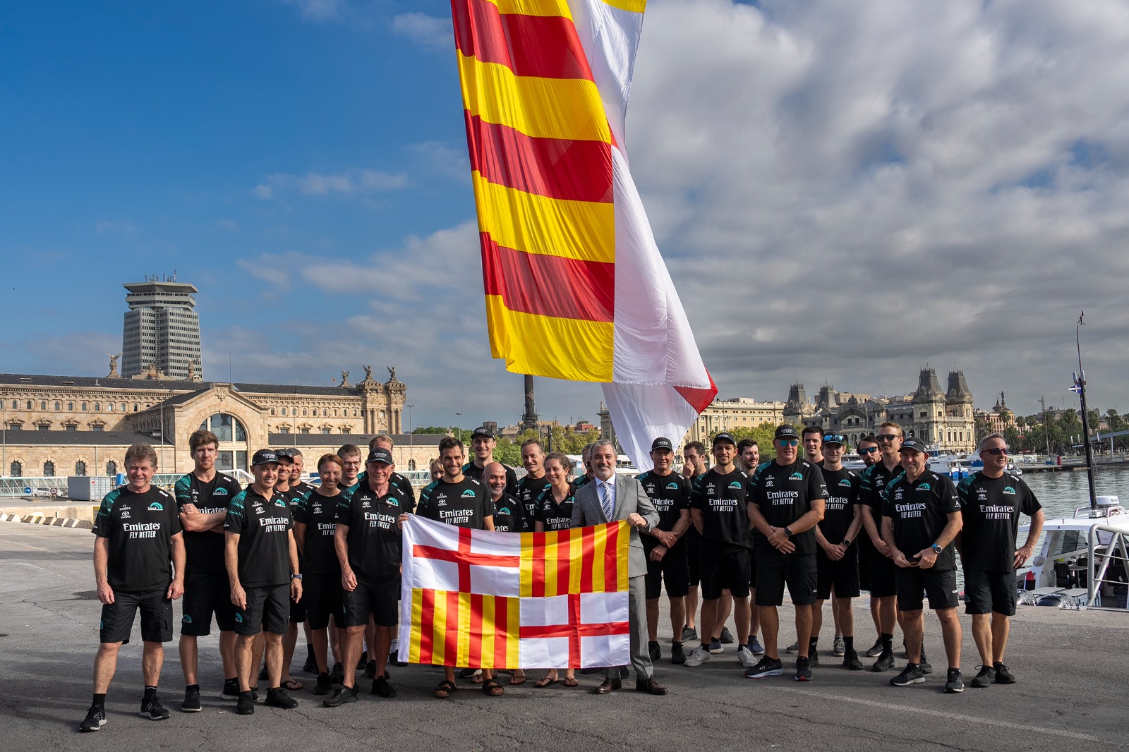 - L’alcalde de la ciutat, Jaume Collboni, ha fet entrega d’una ensenya de la capital catalana al CEO d’Emirates Team New Zealand, Grant Dalton i al COO, Kevin Shoebridge.