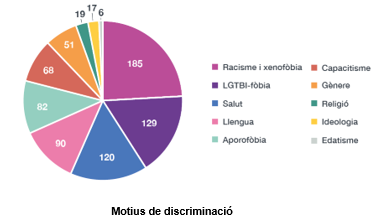 Una discriminació és un acte que vulnera la dignitat, els drets humans i les llibertats fonamentals; és el tracte diferenciat, preferent, restrictiu, excloent o injust a causa de prejudicis, estigmes i creences, que es concreten en una acció de rebuig amb conseqüències perjudicials per a les persones que la pateixen. D’aquestes, el racisme i la xenofòbia són un any més els motius principals, amb 185 situacions, seguit de la LGTBI-fòbia, amb 129, i de salut amb 120. En menor mesura, els motius de discriminació que segueixen són la llengua (90), l’aporofòbia (82), la discapacitat (68), el gènere (51), la religió (19), la ideologia (17) i l’edat (6).