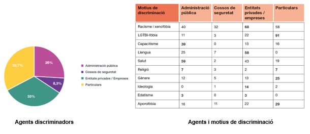 Respecte als agents discriminadors, les entitats i empreses van estar implicades en el 33% de les situacions, el que suposa un increment de 5 punts en relació amb el 2021. En el cas dels particulars, la seva implicació ha baixat més de 10 punts en relació amb l’any anterior, i se situa en un 32,7% dels casos. Més d’un terç dels casos (34,3%) han estat exercits per l’Administració pública (26%) i els cossos de seguretat (8,3%).