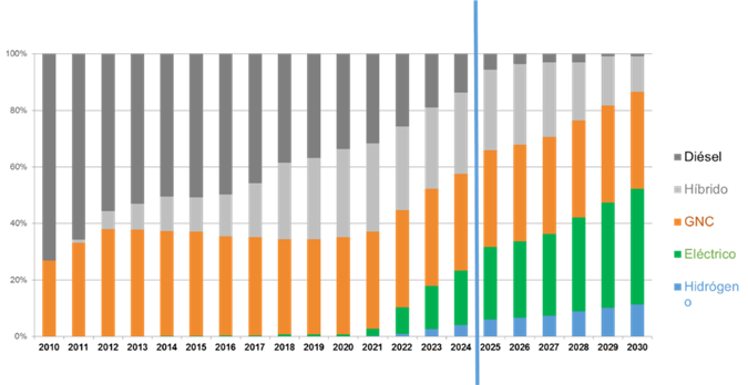 L’aposta de TMB per la sostenibilitat a la seva flota de bus es mostra en el següent gràfic on es pot veure com evolucionarà el nombre de vehicles per tipus de combustible, reduint els dièsel i els híbrids mentre guanyen terreny els elèctrics i els d’hidrogen: