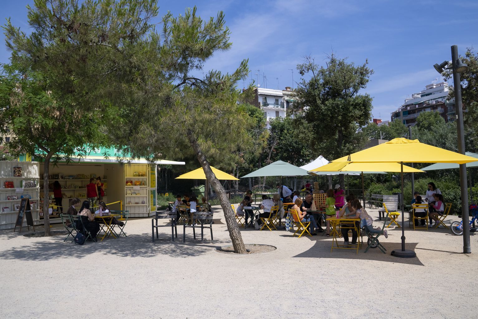 - Espai amb taules i cadires a l’entorn del quiosc de jocs, amb para-sols i racons habilitats per poder jugar