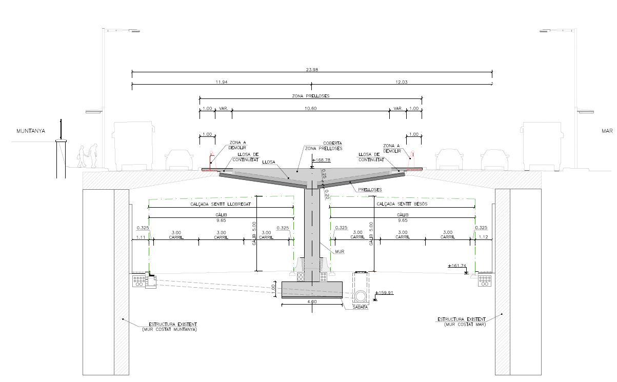L’estructura de cobertura tindrà forma de T i es compondrà d’un mur central de formigó armat i una coberta formada per prelloses recolzades en la coronació del mur central i sobre l’extrem del voladís. Pel que fa a les sortides d’emergència, se n’habilitaran tres al costat mar i tres al costat muntanya, i al llarg de la cobertura s’inclouen sis passos de serveis.