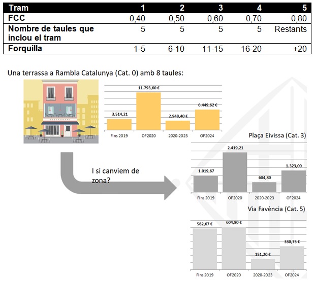 La taxa de terrasses s’ha calculat sempre i se seguirà calculant en funció de la ubicació (categories de carrers 0-5) i del nombre de taules autoritzades. Històricament, però, totes les taules tenien el mateix valor econòmic; a partir d’ara, s’introdueix un nou escalat progressiu, cosa que implica que el cost de les taules, dintre d’un mateix vetllador, varia en el sentit que s’incrementa de forma progressiva a les terrasses grans (a mesura que es va saltant de tram).