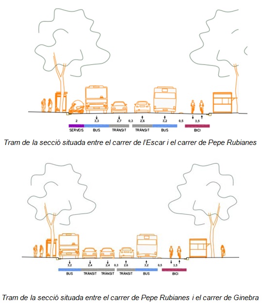 Un cop finalitzin les obres, la configuració de la calçada passarà a ser la següent: la secció en sentit mar inclourà un carril bici bidireccional, un carril bus i un carril de circulació. En sentit ciutat, en el tram comprès entre el carrer de l’Escar i el carrer de Pepe Rubianes hi haurà un cordó de serveis, un carril bus i un carril de circulació; i en el tram situat entre el carrer de Pepe Rubianes i el carrer de Ginebra, un carril bus i dos carrils de circulació.