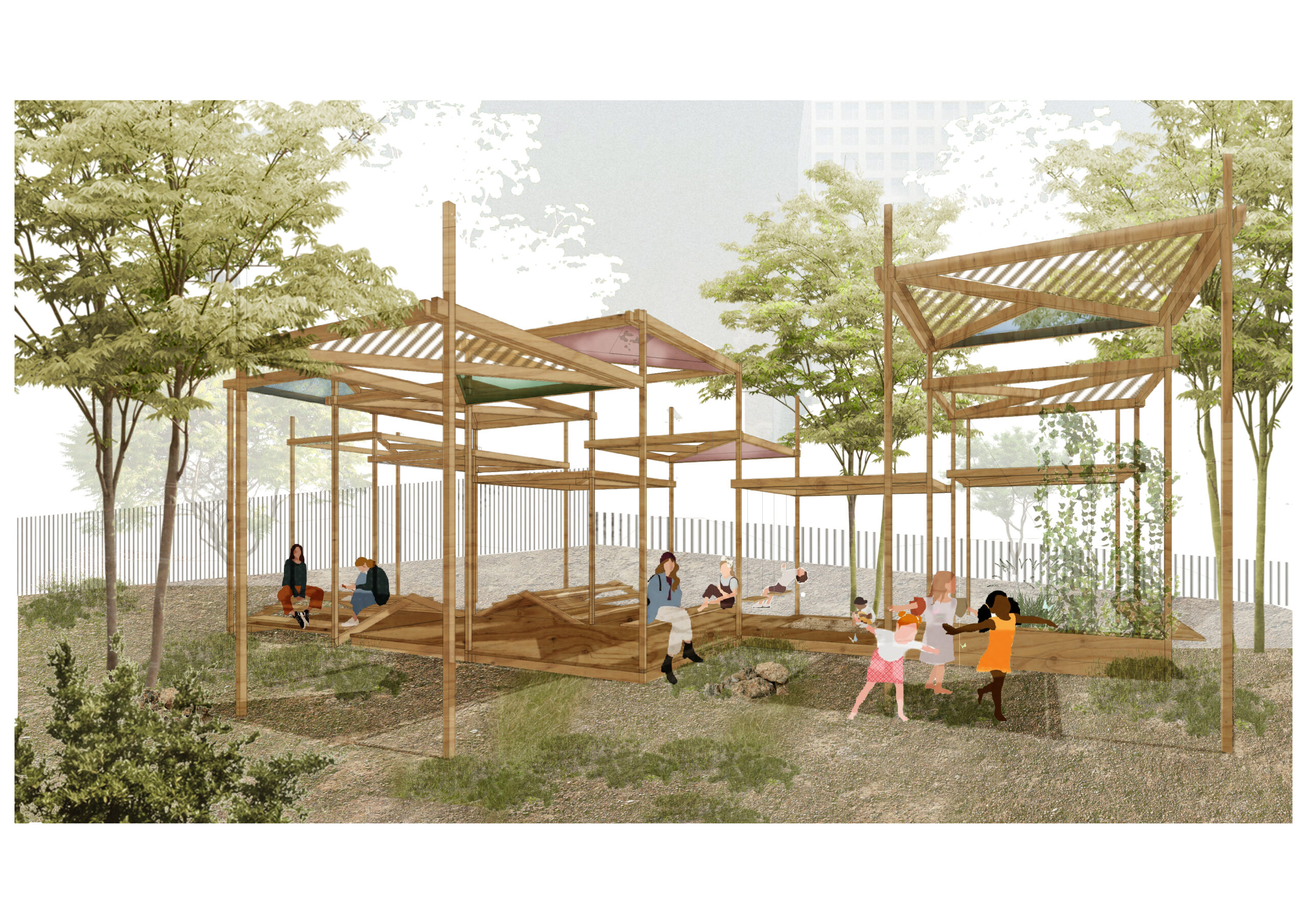 La tercera solució seleccionada, anomenada “A l’ombra del trencadís”, ha estat presentada per Arquitectura de Contacte amb un acord de col·laboració amb Tall fusta. L’estructura base de la proposta està generada per dos panells prefabricats i tecnificats; un de terra i un d’ombra, amb quatre pilars -també tecnificats- que fan de suport vertical. Aquests tres elements clau configuren el sistema de “A l’ombra del trencadís”. Un sistema clar, senzill -que no simple- i reproduïble, amb una escala molt humana que serveix de refugi de descans, de relació i climàtic per a qualsevol entorn urbà de la ciutat.