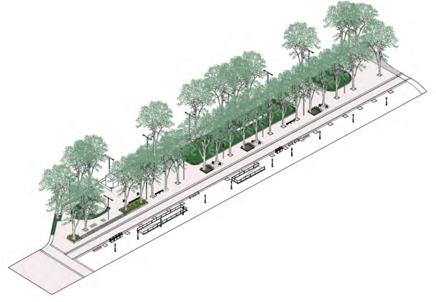 - La calçada del costat Llobregat es transformarà en plataforma única i es crearan parterres que delimitaran l’espai de pas de vehicles i nous espais d’ús veïnal amb una trentena de bancs i cadires