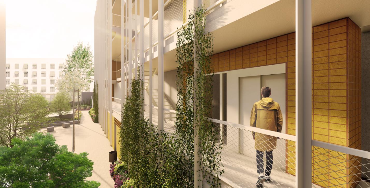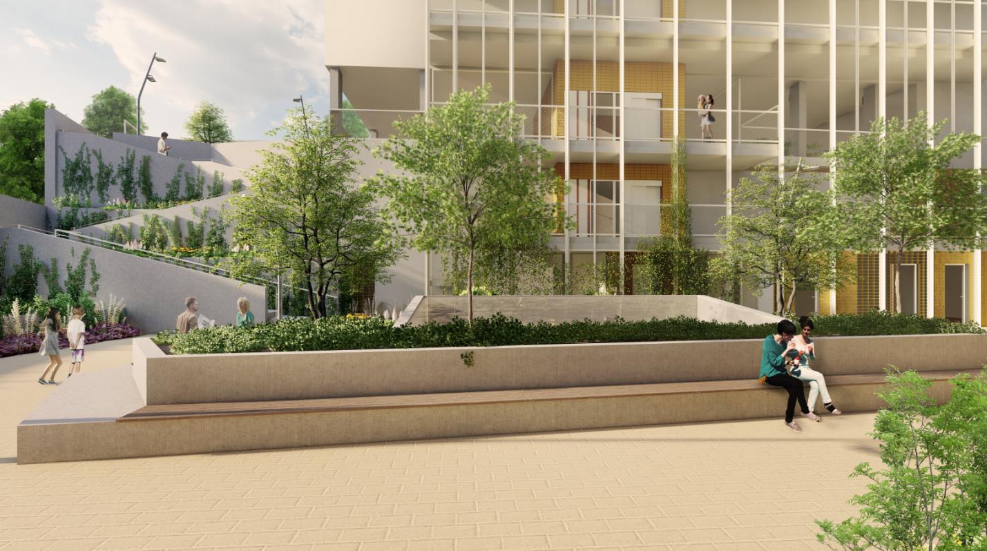 A nivell arquitectònic, la nova promoció de 53 pisos disposarà d’un pati interior pensat com una gran plaça pública, on s’ubicaran els quatre vestíbuls de la promoció, de manera que funcionarà com a espai de centralitat de l’edifici i de relació del veïnat. Atesa la topografia del terreny, les quatre escales tindran un nombre diferent de plantes, de manera que les escales A i B tindran planta baixa i cinc plantes pis, la C arrencarà a la primera planta fins a la cinquena, i la D, al seu torn, arrencarà a la tercera planta i creixerà fins a la cinquena.
