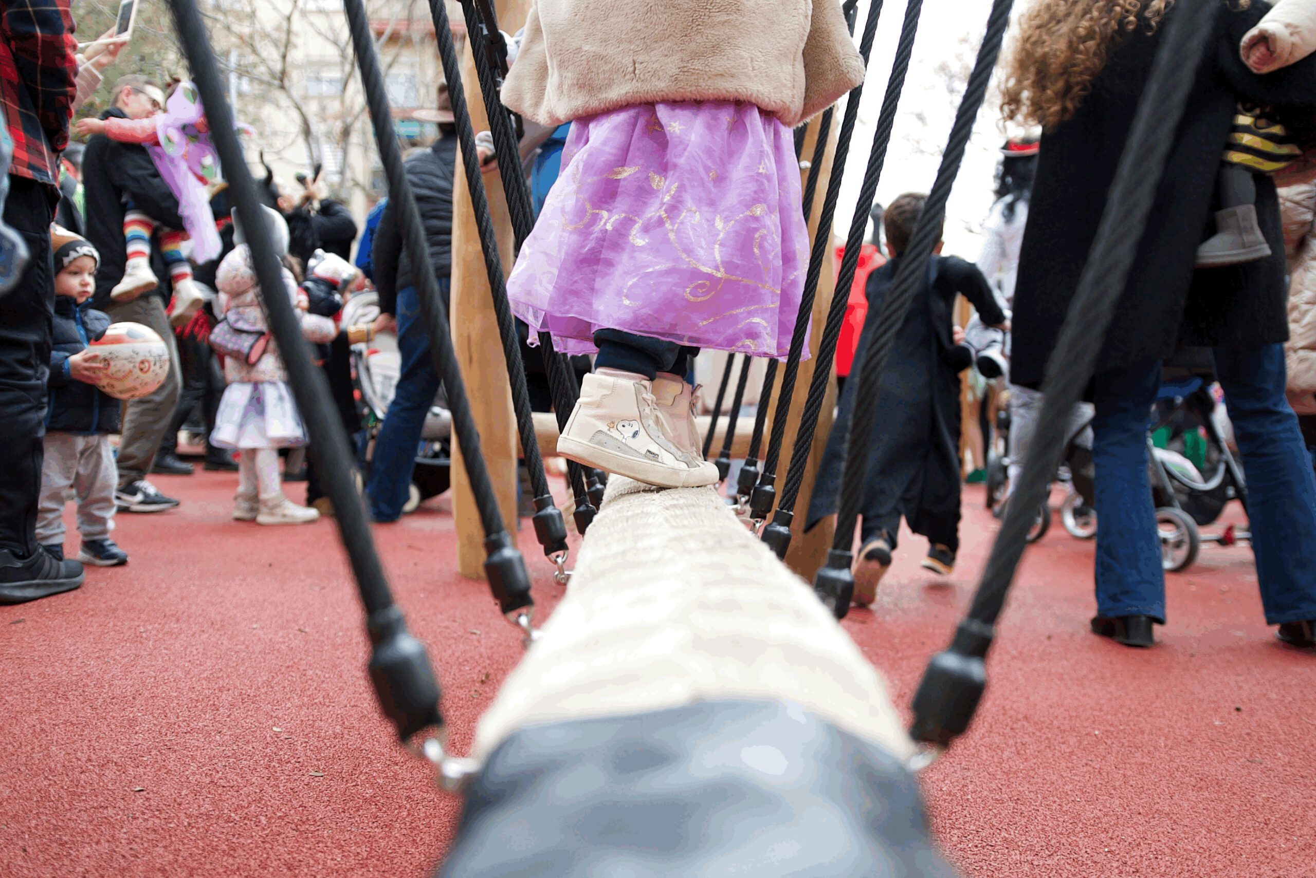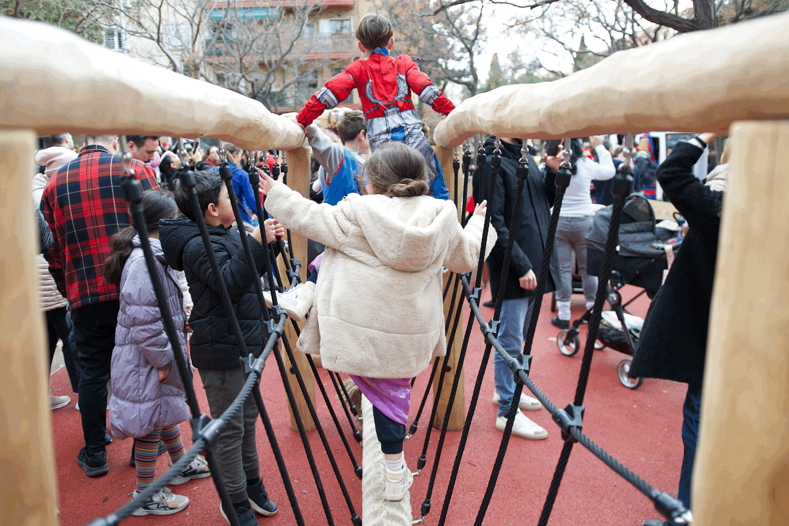 La renovada plaça del Rom Cremat conjuga els usos tradicionals de l’espai amb el joc infantil en un espai més accessible i continu, amb els espais existents reordenats, que fomenta i facilita la convivència amb altres usos del veïnat.