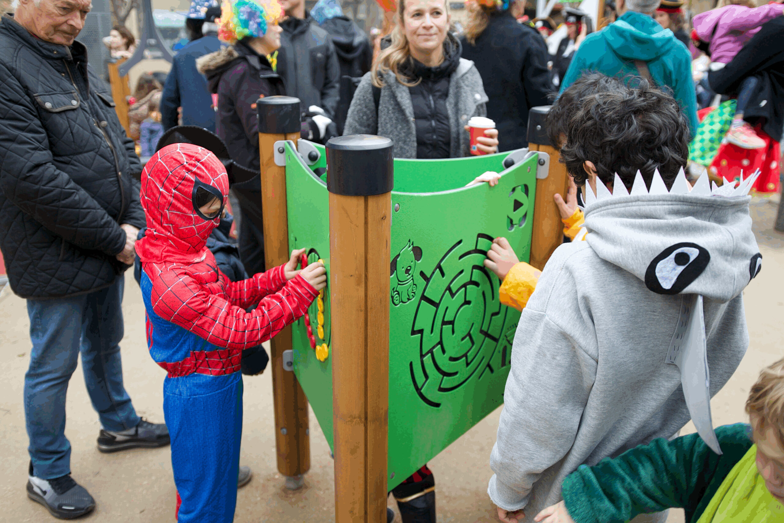 L’àrea de jocs infantils ha incrementat l’espai, passant de 158 a 226 metres quadrats, a més de guanyar en accessibilitat. Dins d’aquest àmbit, se situen dues grans catifes d’activitats: una polivalent i l’altra destinada al joc infantil. A la zona polivalent es canvia el color del paviment a través d’un escenari de formes geomètriques i de jocs tradicionals. Pel que fa a la zona de jocs, s’ha instal·lat un part de sorral i paviment de cautxú amb elements accessibles per gronxar-se, saltar o expressar-se.