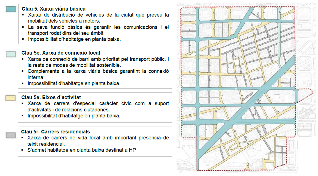 - Mobilitat sostenible i jerarquitzada: Es defineixen diferents nivells en la xarxa viària i de carrers dels dos barris per tal de regular els usos i els desplaçaments i protegir la vida local i les activitats dels teixits residencials: