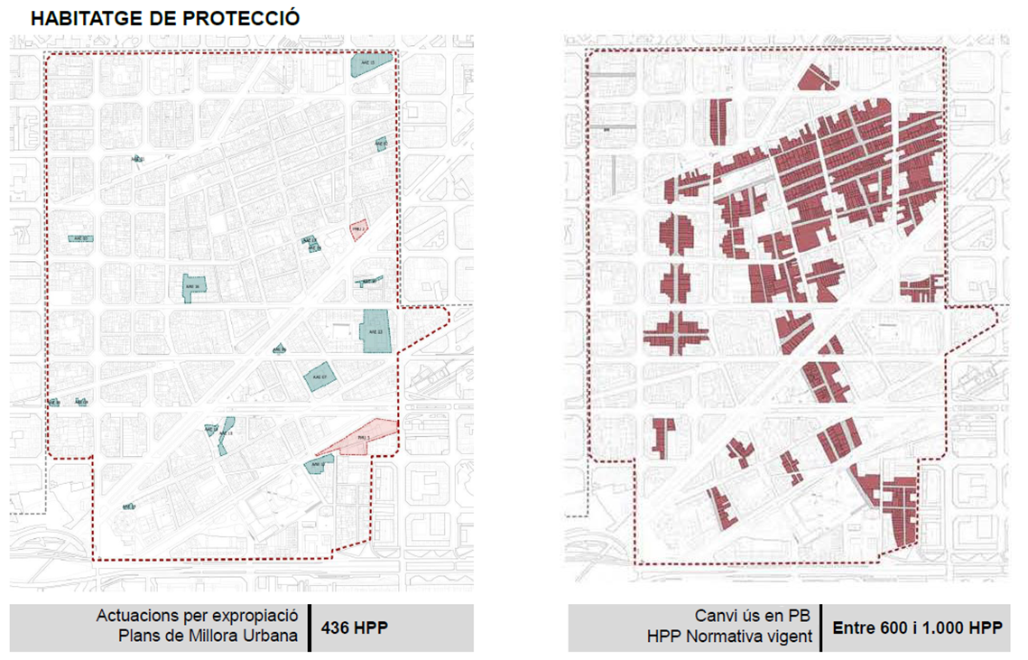 - Actuacions expropiatòries: L’MPGM qualifica vàries parcel·les de l’àmbit com a sòl destinat a habitatge protegit, amb una superfície aproximada de 8.500 m². Aquestes parcel·les es destinaran a la construcció d’habitatge de protecció d’iniciativa pública amb règim específic. Una part d’aquestes parcel·les ja són de titularitat municipal, i la resta es preveu que s’adquireixin via expropiacions a executar per part de l’Ajuntament, amb un calendari d’obtenció dels sòls establert en el document. Segons els càlculs realitzats, en aquests sòls el consistori hi podria edificar un total de 436 habitatges protegits.