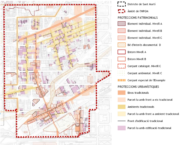 A més, l’MPGM introdueix una sèrie de normes que determinen la protecció urbanística de diversos eixos, ambients i fronts tradicionals i amb interès patrimonial dels dos barris: