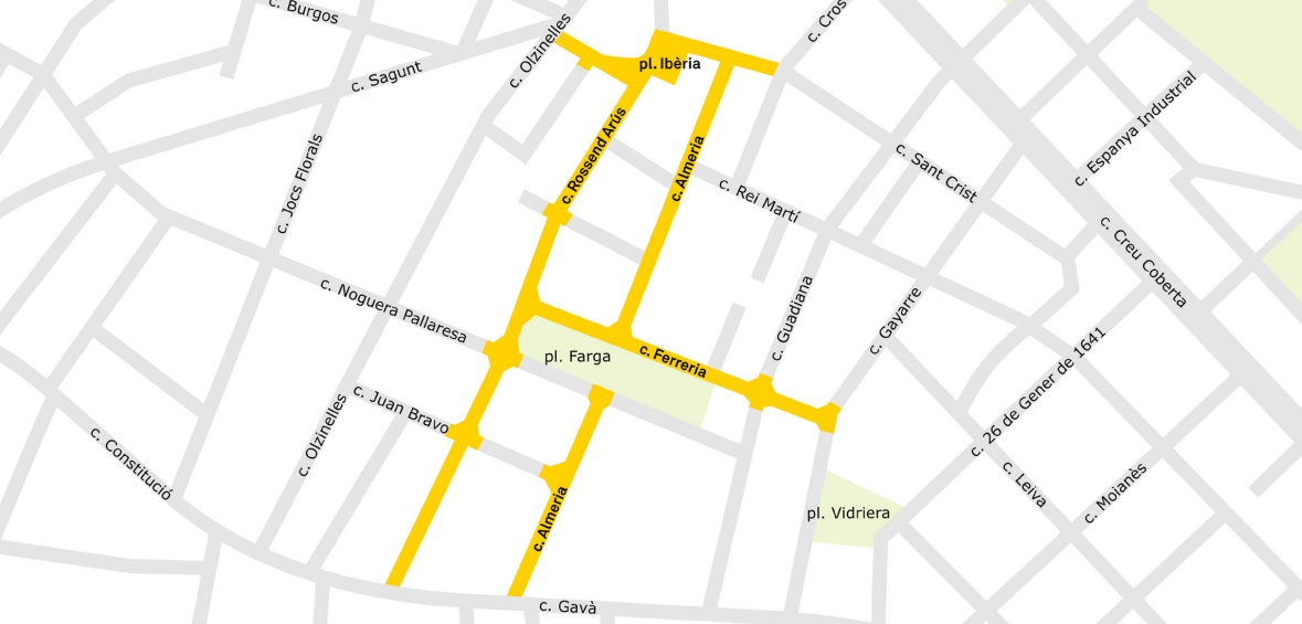 Des d’ara fins al maig s’instal·len nous senyals de carrer amb prioritat de vianants i prohibició de pas excepte bicicletes a tots els carrers de plataforma única. També hi haurà nou mobiliari urbà dels carrers Rossend Arús, Almeria, Ferreria i la plaça d’Ibèria per delimitar el pas de vehicles i habilitar-hi nous espais per a vianants. La circulació en ziga-zaga del carrer d’Almeria es consolida i s’amplia al carrer de Rossend Arús. A la plaça d’Ibèria s’elimina el pas de vehicles i al carrer de la Ferreria es pinta la calçada perquè la prioritat sigui del vianant. Els treballs es faran per trams i les afectacions a la circulació de vehicles i el pas de vianants seran molt puntuals. El conjunt de l’actuació té un pressupost de 198.500 euros.