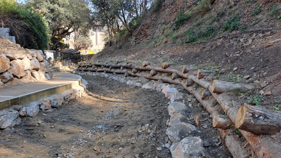 - Execució de murs d’escullera i murs Krainer: el mur d’escullera conté el camí de servei. El mur Krainer ha consistit en l’execució d’entramats de troncs de fusta amb vegetació als marges i ribes per fixar-los i protegir-los de l’erosió, i així evitar les pèrdues de sòl. Aquesta actuació millora també l’escorrentia de l’aigua i l’hàbitat fluvial, protegint la flora i fauna de l’entorn.