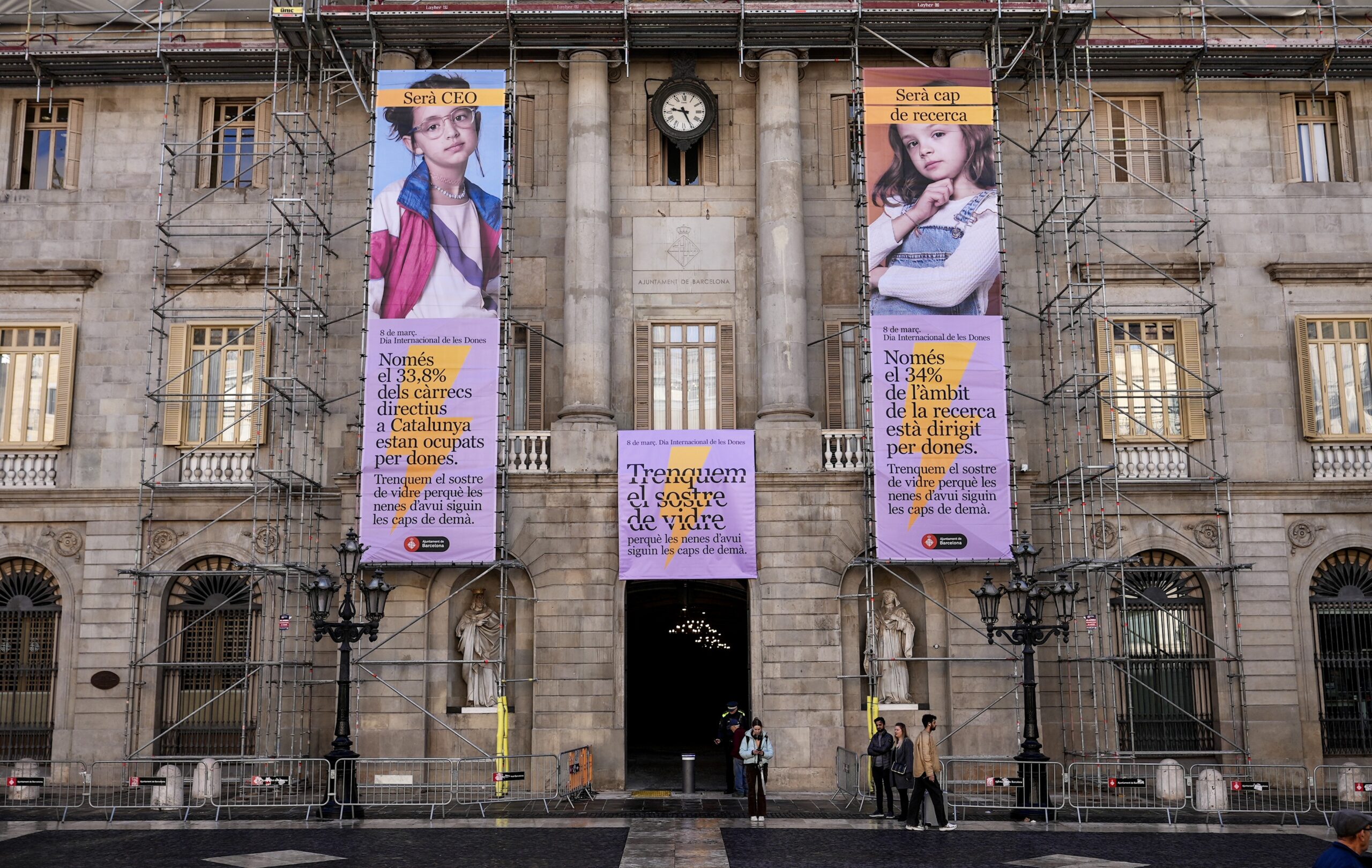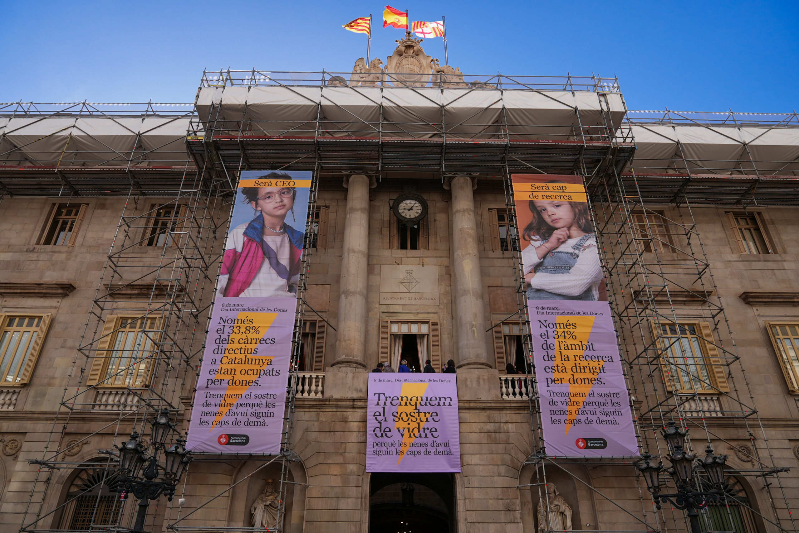 El balcó de l’Ajuntament exhibeix una pancarta amb el lema de la campanya municipal pel 8M d’enguany “Trenquem el sostre de vidre”. La campanya posa l’accent en treballar perquè les nenes d’avui es trobin un futur en què puguin assolir posicions de responsabilitat en l’esfera professional en condicions d’igualtat amb els homes. Avui dia, la majoria de les posicions directives tant en l’àmbit privat com en el públic encara són ocupades majoritàriament per homes, mentre que les dones s’estanquen en les que requereixen menys qualificació, fins i tot en els sectors professionals més feminitzats.