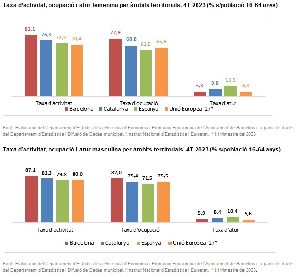 El quart trimestre de 2023 va marcar una fita històrica a Barcelona en termes laborals, amb les taxes d’activitat (85%) i d’ocupació (79,8%) més altes de la sèrie històrica, que s’inicia el 2002. La ciutat també ha registrat les millors dades dels últims 20 anys pel que fa a l’ocupació femenina: tant la taxa d’activitat femenina (83,1%) com la taxa d’ocupació femenina (77,9%) són superiors a les de Catalunya, Espanya i la Unió Europea i assoleixen els seus millors registres històrics.
