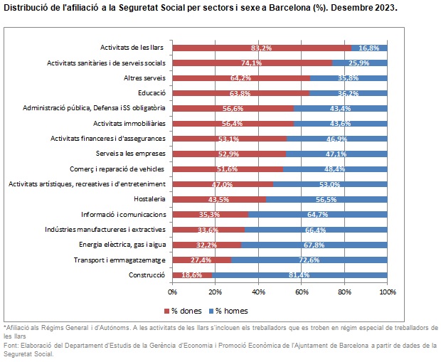 Les dades d’afiliació posen de manifest la presència desigual de les dones als sectors de l’economia: oscil·len entre el 18,6% dels llocs de treball de la construcció i el 83,2% dels de les activitats de les llars.