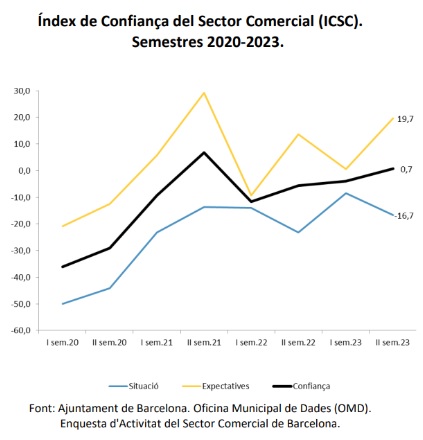 L’Índex de Confiança del Sector Comercial (ICSC) va millorar a Barcelona durant el 2023, quan es va situar en un valor positiu de 0,7, que suposa un augment de més de sis punts en relació a l’any anterior (quan se situava en -5,7) i d’uns 37 punts si es fa la comparativa amb el primer semestre del 2020 (-36,2 punts) en plena pandèmia. Així ho recullen les dades de la primera i la segona onada del 2023 en l’informe elaborat per l’Oficina Municipal de Dades (OMD) aquest mes de març, que mostra optimisme dels titulars de negocis comercials respecte a la seva activitat a la ciutat. Aquest informe és una de les publicacions periòdiques de l’OMD.