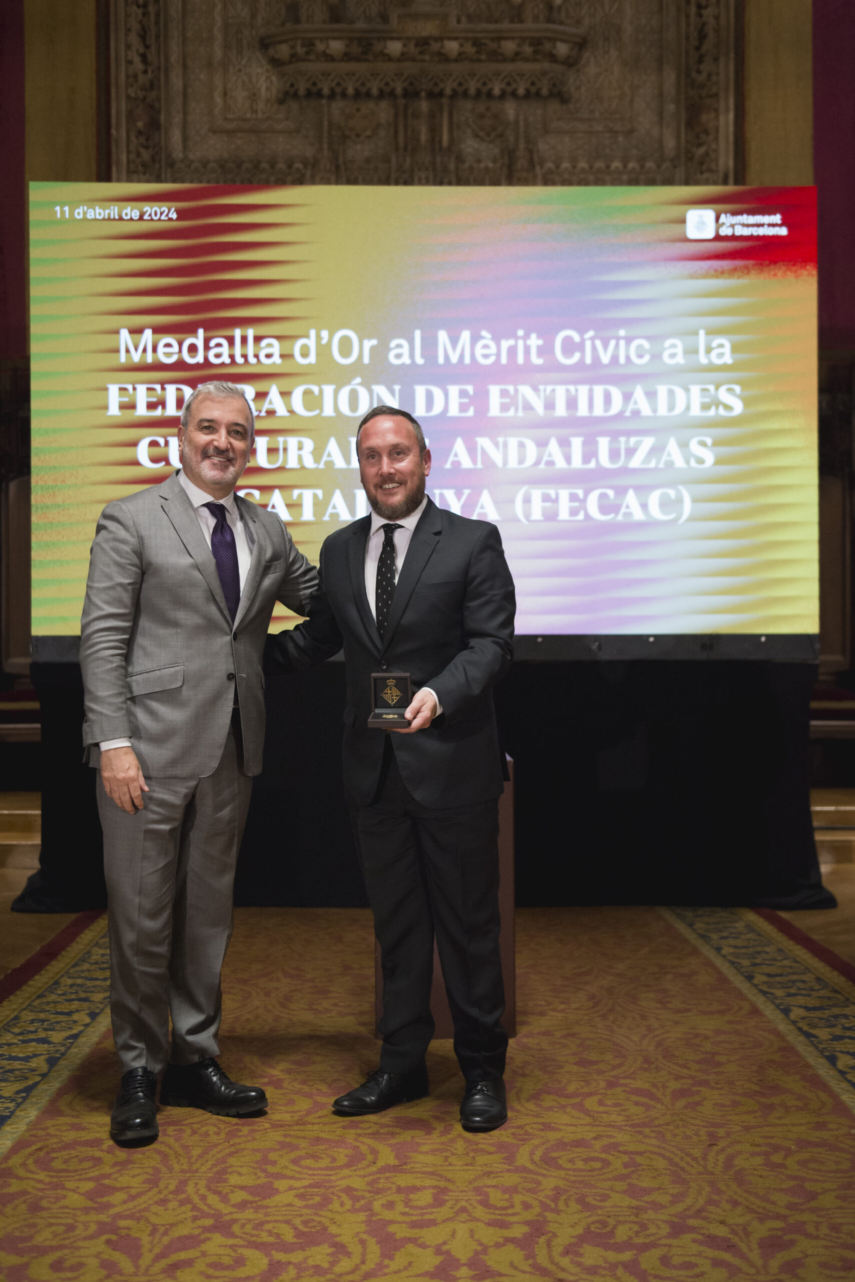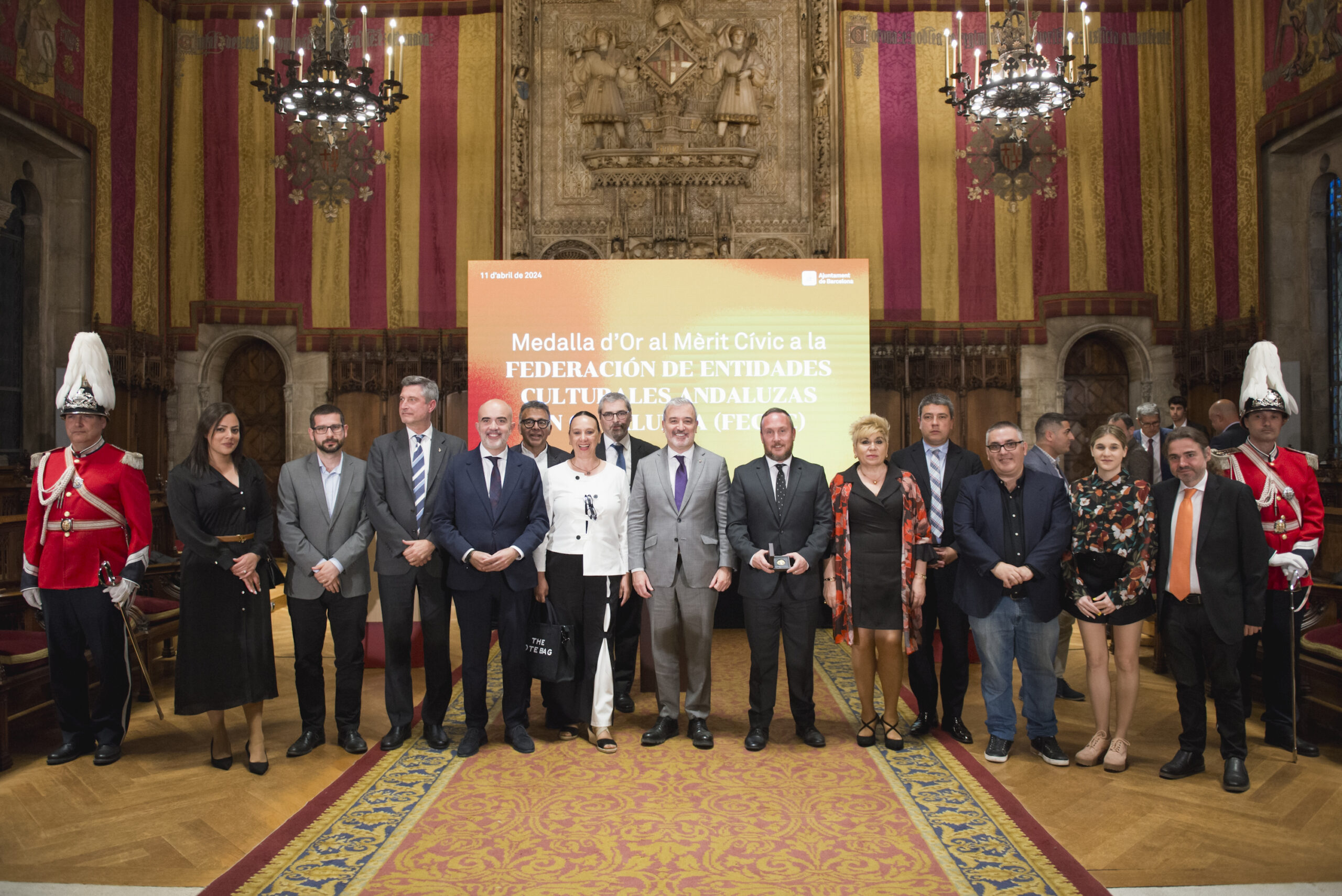 L’alcalde de Barcelona, Jaume Collboni, ha presidit aquesta tarda l’acte de lliurament de la Medalla d’Or al Mèrit Cívic a la Federació d’Entitats Culturals Andaluses a Catalunya (FECAC) en reconeixement de la seva tasca en favor de la difusió de la cultura i tradicions andaluses i amb motiu de la celebració, l’any passat, del 50è aniversari de la Feria de Abril a Catalunya i la 50a Romería del Rocío a Catalunya. L’atorgament de la Medalla va ser aprovada per unanimitat en sessió plenària del Consell Municipal el passat mes de setembre.