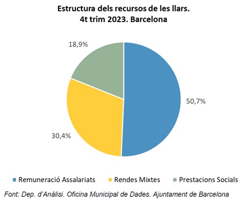Al gràfic adjunt es por veure el percentatge de cada un dels tres components sobre el total de recursos al quart trimestre de l’any 2023. La meitat dels recursos provenen del treball assalariat, amb un 50,7%, seguit de les Rendes Mixtes (30,4%) i de les Prestacions Socials (18,9%).