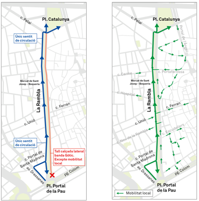 En el moment en què comencin les obres i durant els primers mesos, en els quals la circulació anirà per la calçada del costat Raval, la mobilitat al llarg de la Rambla i d’accés al passeig des de l’entorn quedarà tal com es mostra en aquests plànols: