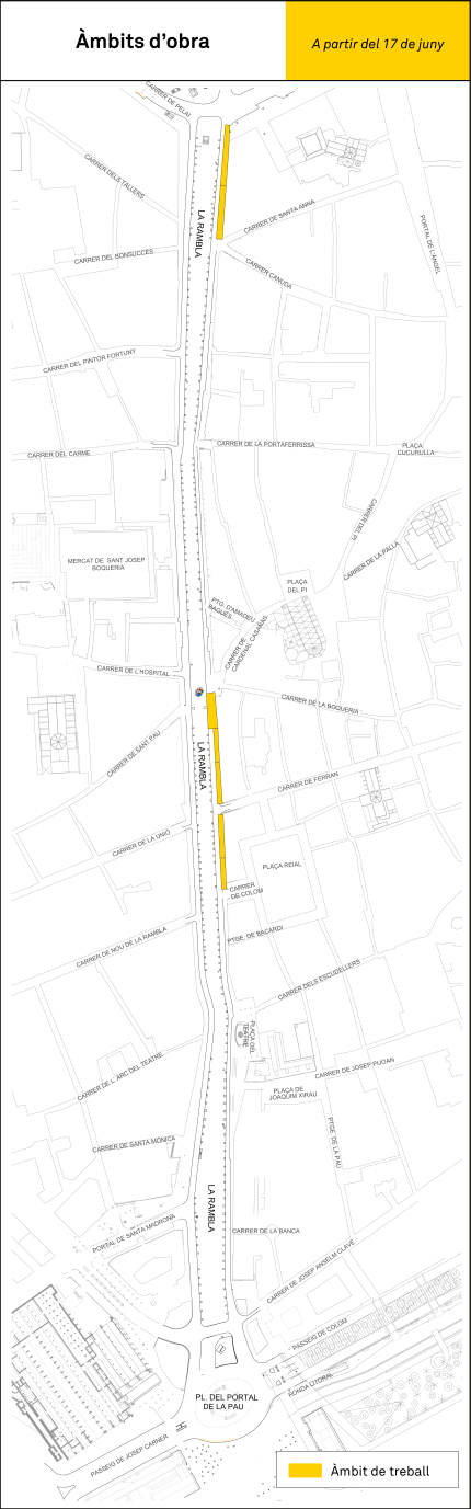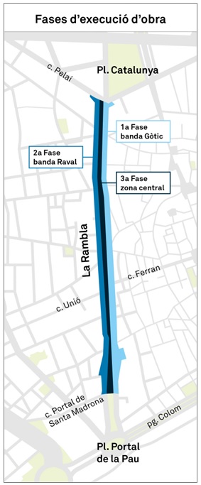 Actualment s’està encarant la recta final de les obres de la Rambla entre Colom i Santa Madrona, el primer dels cinc àmbits definits pel projecte executiu, que es preveu que acabin a l’estiu. I la previsió és que el 17 de juny es pugui iniciar les obres als altres quatre trams: Santa Madrona-Arc del Teatre, Arc del Teatre-Liceu, Liceu-Portaferrissa i Portaferrissa-Canaletes.