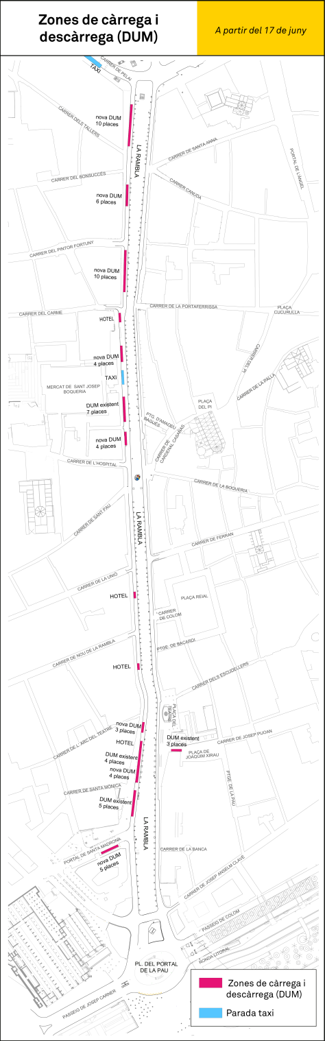 L’accés als habitatges, comerços, pàrquings, espais culturals com teatres i museus i el pas de serveis i emergències quedarà garantit. Pel que fa a la càrrega i descàrrega, quedarà restringida als espais habilitats amb aquesta finalitat. Durant la fase 1 de les obres, les zones habilitades seran les que es mostren al següent plànol. I en la fases 2 i 3 ja s’utilitzaran les places previstes pel projecte definitiu a la calçada del costat Besòs, que ja estarà renovat i per tant ja s’hi hauran habilitat les zones DUM.