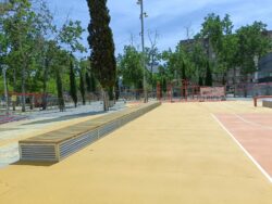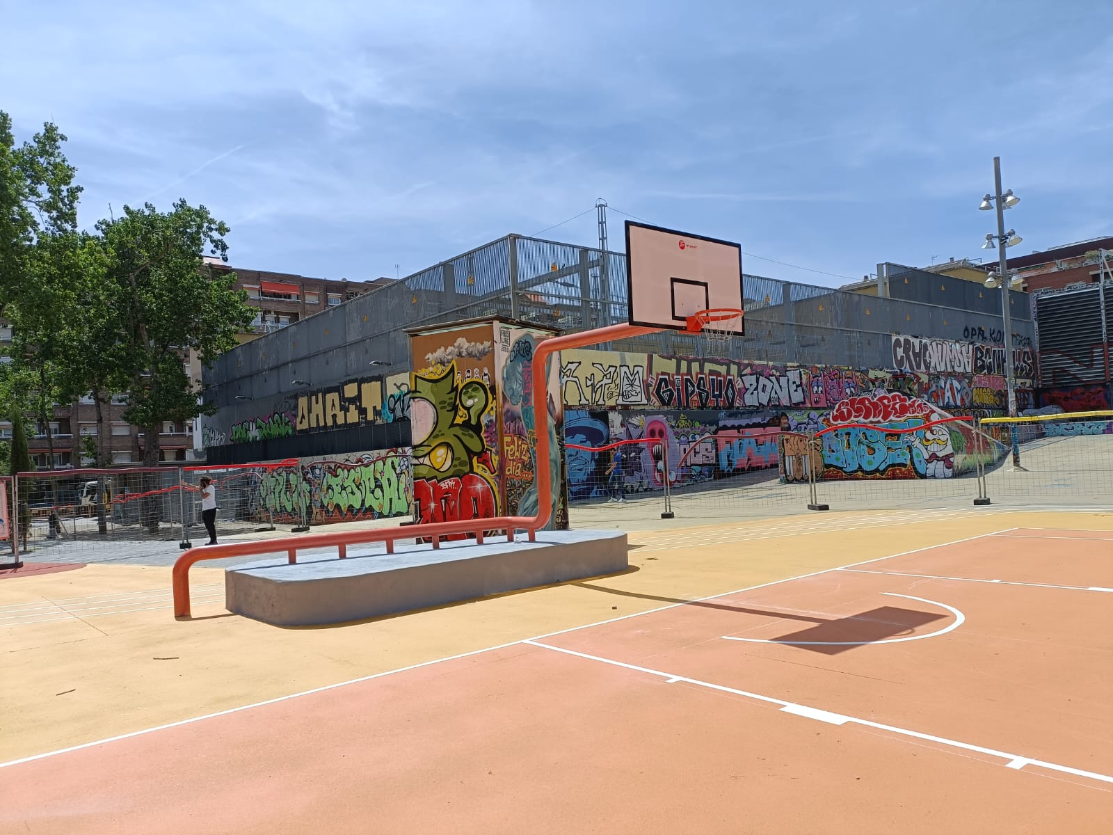 - Una pista de bàsquet ocupa l’espai central, hi ha elements d’estada i de gimnàs a l’aire lliure i s’ha millorat l’accessibilitat pel vianant a través del jardí entre el Raval, el Paral·lel i el Poble-sec
