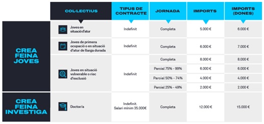 En l’actual edició, les empreses i persones treballadores en règim autònom podran rebre ajuts de fins a 8.000 € per cada nou contracte de persones joves menors de 30 anys (l’import varia  augmentant en el cas que es tracti de dones, o la situació de la persona contractada: atur, primera ocupació o situació d’atur de llarga durada, o risc d’exclusió) i de fins a 15.000 € en el cas de contractacions de dones amb titulació de doctorat. Pel que fa al personal investigador, per poder optar a la subvenció l’empresa haurà de garantir l’aplicació d’un salari no inferior a 35.000 euros bruts anuals.