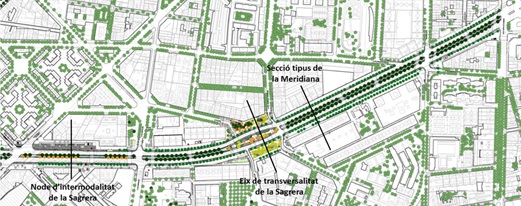 El node Sagrera de transversalitat abastarà l’àmbit dels carrers del Cardenal Tedeschini, Pegàs, Antilles i Olesa, i serà molt similar al que s’ha creat a Navas. Hi haurà un espai central ampli per als vianants i el carril bici se situarà a banda a banda i serà unidireccional. També es milloraran els jardins d’Ángeles López de Ayala, on els jocs infantils passaran a ser accessibles, i també l’eixamplament de la Meridiana entre els carrers d’Antilles i Pegàs, amb més vegetació i espais verds de qualitat a tots dos espais. En aquest àmbit es faran dos passos de vianants nous, i en total n’hi passarà a haver quatre.