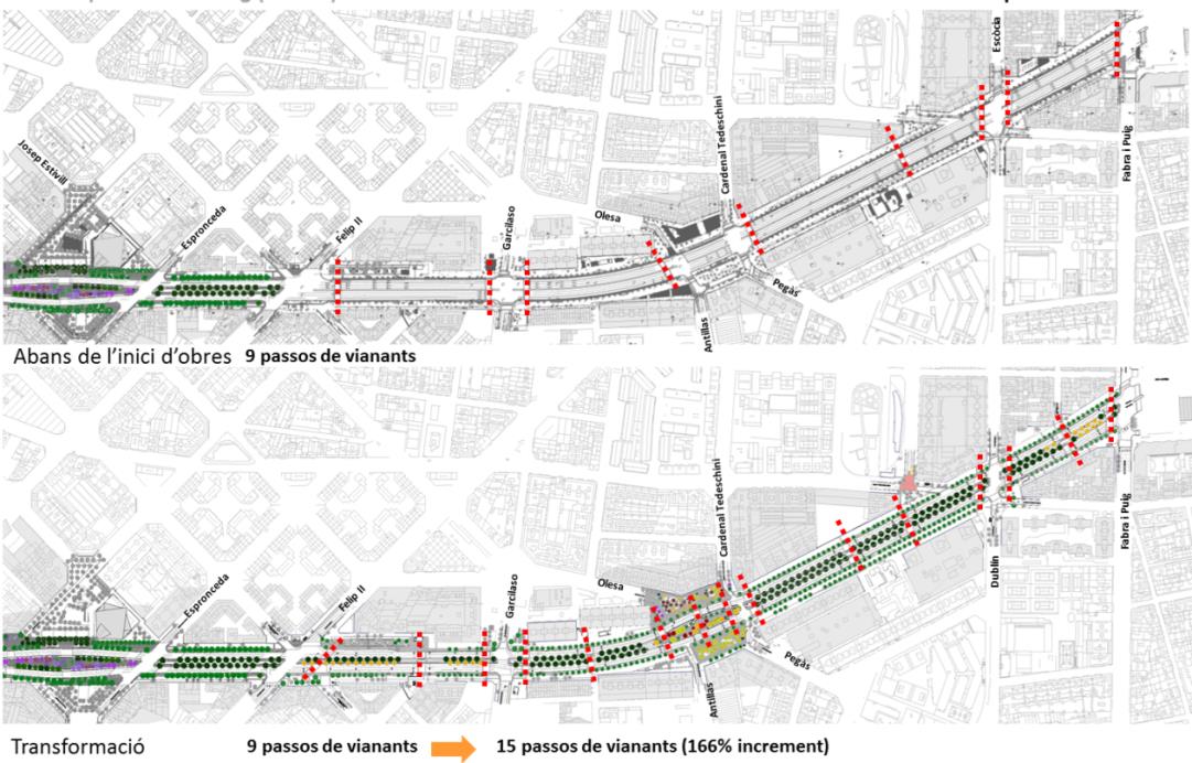 - L’Ajuntament finalitza la reurbanització des de Navas de Tolosa-Josep Estivill fins a Felip II i defineix el calendari dels treballs fins a Fabra i Puig per continuar convertint la via en un eix ciutadà amb més verd, espai per al vianant i la mobilitat sostenible