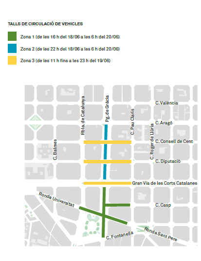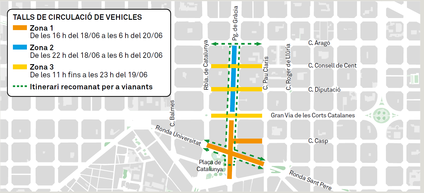 Des del dimarts 18 de juny a les 16:00 hores i fins al dijous 20 de juny a les 6:00 hores els vehicles no podran circular per l’àmbit més proper a la plaça de Catalunya, que inclou les vies següents: