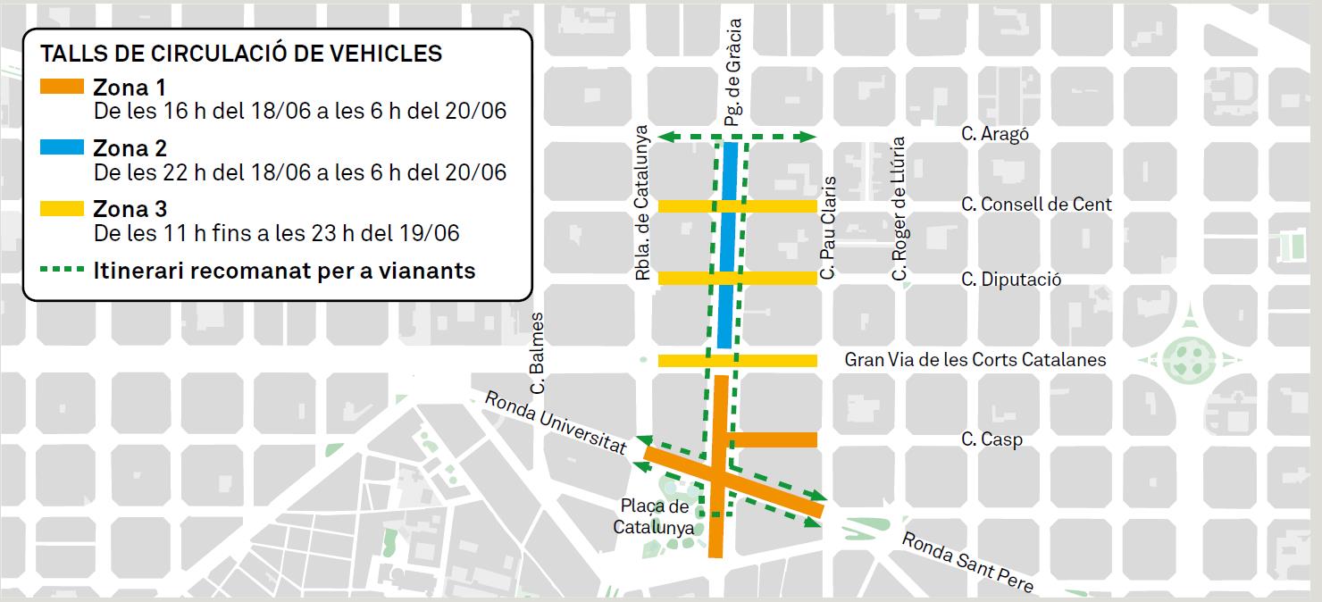Des d’avui dimarts, 18 de juny, a les 16:00 hores i fins al dijous, 20 de juny, a les 6:00 hores els vehicles no podran circular per l’àmbit més proper a la plaça de Catalunya, que inclou les vies següents: