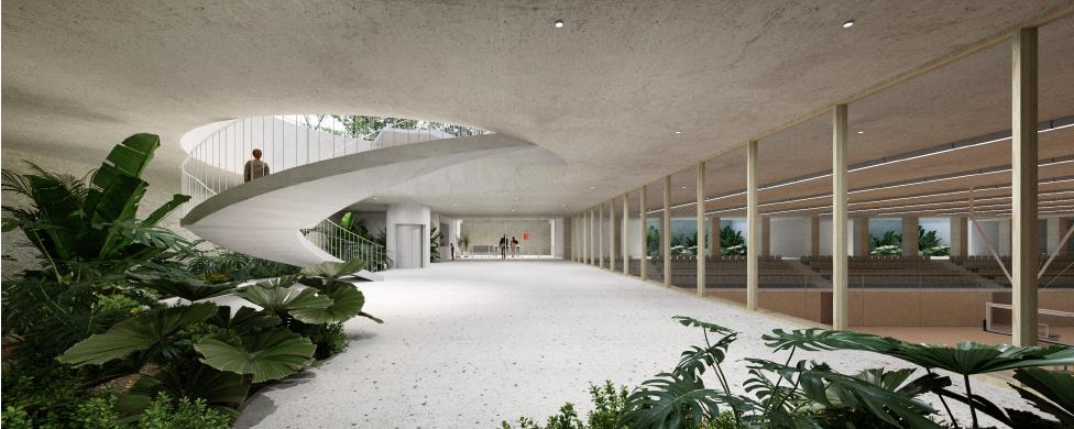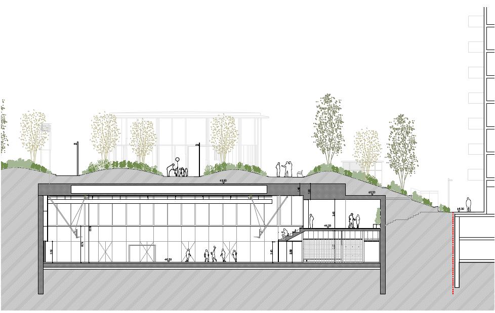Una pèrgola fotovoltaica marcarà l’accés a l’equipament, que rebrà il·luminació natural des del parc a partir d’una obertura en el terreny. En aquest sentit, el pavelló soterrat s’ha estructurat en tres nivells. El primer serà l’accés a la cota del parc i permetrà baixar a un vestíbul semi-exterior a través de l’ascensor o escala.