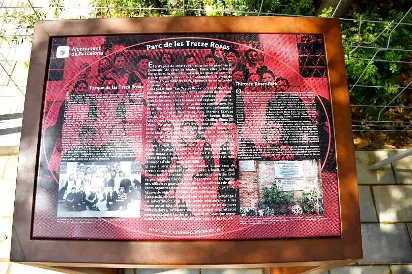 Al parc hi haurà un altre element de memòria històrica, aquest permanent, que també s’ha inaugurat avui, és el faristol que explica qui eren les Tretze Roses que donen nom al parc. El text recull que les tretze roses eren el grup de noies, algunes d’elles membres de les Joventuts Socialistes Unificades (JSU), afusellades pel règim franquista a Madrid, el 5 d’agost de 1939, poc després de la fi de la Guerra Civil espanyola. El nom del Parc de les Tretze Roses, proposat per l’associació Memorial Democràtic de Treballadors de la SEAT, el va triar el veïnat en una consulta al barri.