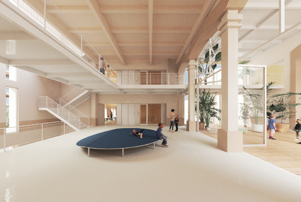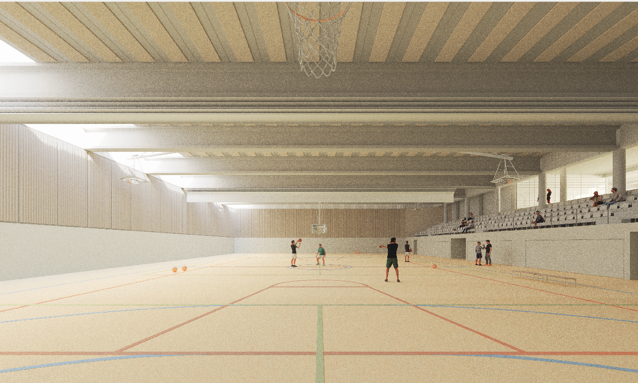 En la proposta guanyadora, el pavelló poliesportiu soterrat s’inscriu en el perímetre triangular del pati d’illa, sense envair l’espai ocupat per l’edificació existent, la qual cosa millora les expectatives de construcció respecte al Projecte d’Ordenació de 2022 doncs en aquell el pavelló ocupava part de l’edificació existent fet que complicava substancialment seva la construcció.