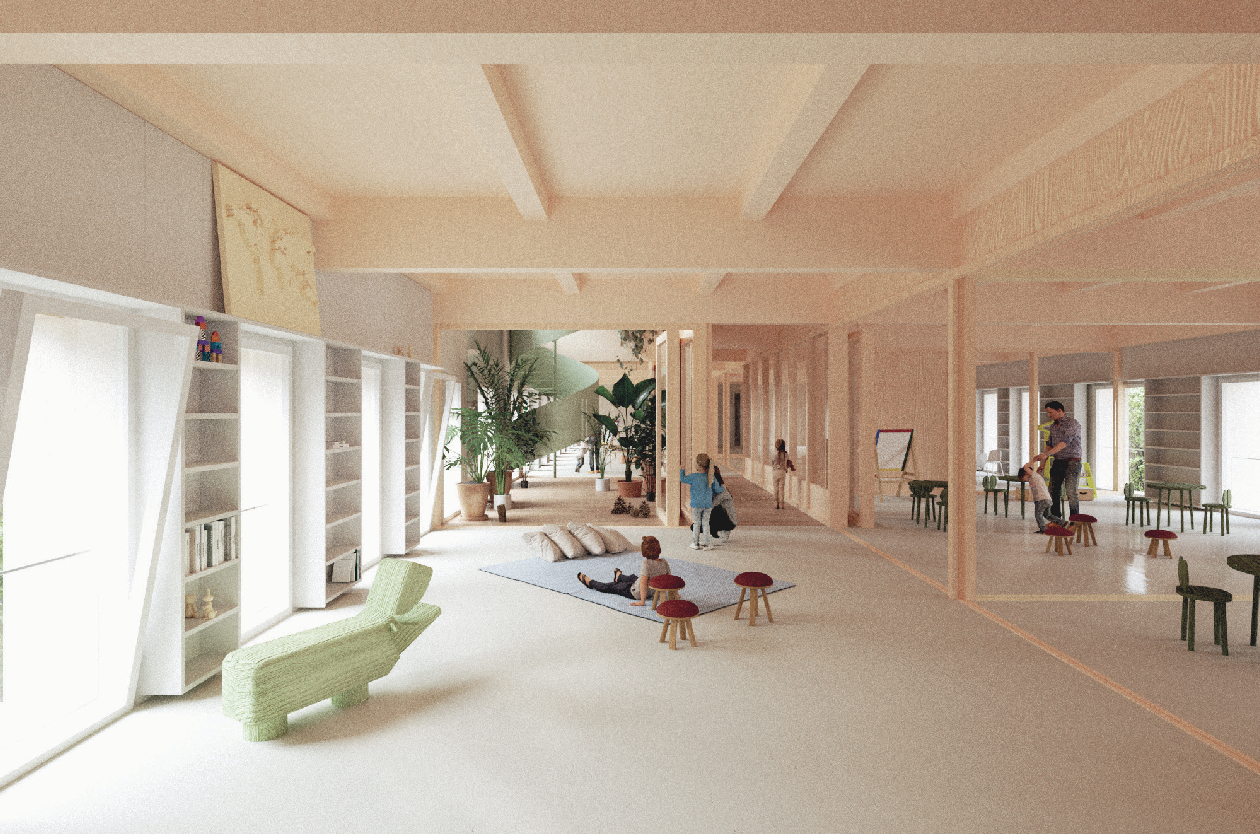 Recreacions virtuals dels espais interiors de l’institut escola, elaborades per l’equip adjudicatari de la redacció del projecte executiu.