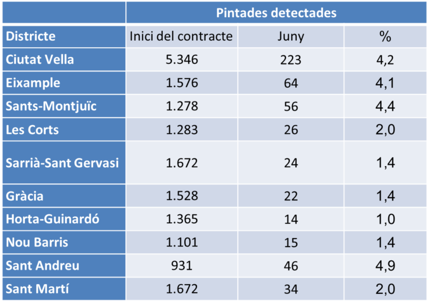 - Aquests àmbits es mantenen un 95% més nets de pintades que abans: les detectades a finals de juny no arriben a cap districte al 5% de les identificades al principi del contracte