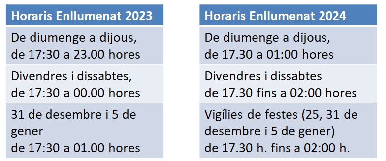- Aquest Nadal, els llums estaran encesos durant més hores: com a màxim fins a la una de la nit de diumenge a dijous, i fins a les dues de la nit els divendres, dissabtes i vigílies de festius