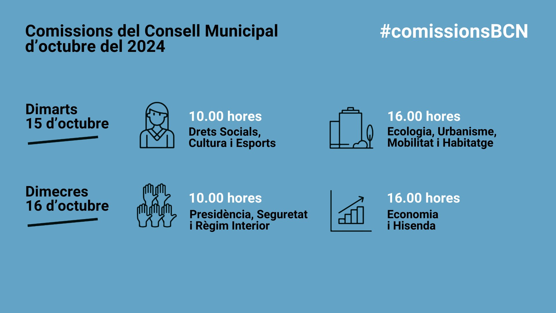 - Els dies 15 i 16 d’octubre de 2024 tenen lloc les reunions de les Comissions de Plenari, prèvies a la celebració del Plenari del Consell Municipal. Les Comissions podran seguir-se en directe al lloc web del Servei de premsa.