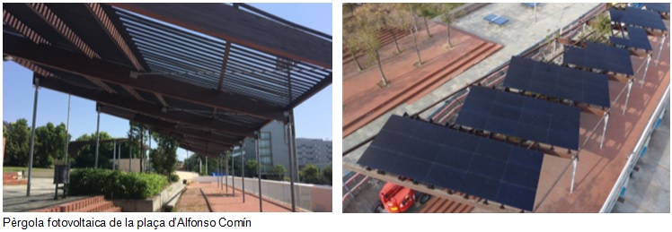 Pel que fa a la pèrgola de la plaça d’Alfonso Comín, al districte de Gràcia, és una instal·lació amb una potència instal·lada de 24,32 kWp i una generació estimada de 30.400 kWh/any. En aquest cas abastirà 30 llars per concurrència pública i 15 llars més amb vulnerabilitat. L’Ajuntament es reserva una potència d’1,5 kWp per als subministraments municipals de l’entorn.