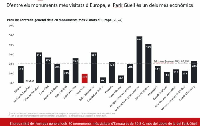 - Actualment el Park Güell és el segon monument més visitat de Barcelona i es troba entre els deu més visitats d’Europa. El preu de la seva entrada és un 50% inferior al de la resta d’espais monumentals europeus i d’altres obres d’Antoni Gaudí a la ciutat