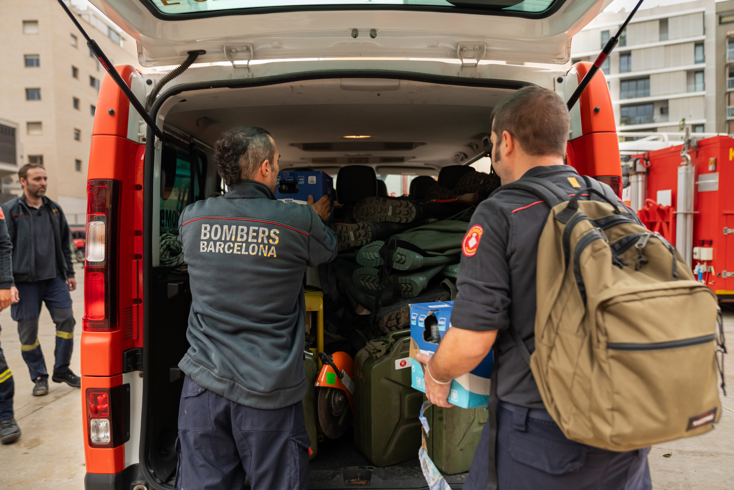 Aquest matí ha sortit el primer comboi amb personal per fer el relleu dels Bombers de Barcelona que treballen a les zones afectades pels aiguats. En total es desplacen 33 efectius en autobús i també 3 vehicles més, un camió cisterna, un camió autobomba per fer extracció d’aigua i una furgoneta, entre altres material per contribuir en les tasques de recuperació.
